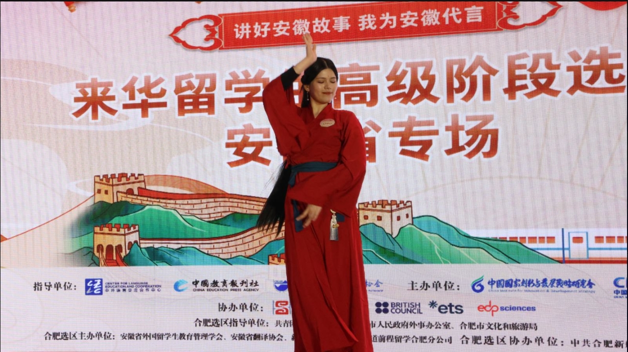 经前期选拔和评审,来自21个国家的80余位选手共赴安徽省高级阶段选拔专场。高级阶段设有主题演讲、即兴问答、中华才艺展示三个环节,各参赛选手按照抽签顺序依次进行展示。我校俄罗斯籍留学生迪舒苒以“成为传播中国文化的使者”为主题,讲述自己“以语言为舟,文化作帆,用翻译架起心灵桥梁”的中国故事,并回答了评委提问、展示了书法才艺,最终斩获一等奖。我校其余三名来华留学生经三个环节的展示,最终获得三等奖。