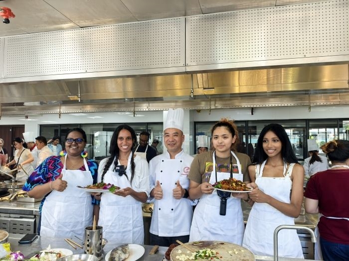 徽菜制作环节,我校研学教师介绍了徽菜历史及独特风味,并演示了徽州名菜臭鳜鱼的烹饪艺。研学团在教师指导下亲自动手烹饪,体验徽菜独特的烹饪理念。他们现场品尝自己制作的臭鳜鱼,对其鲜嫩的口感和浓郁的风味赞不绝口,纷纷用手机记录这难忘的美食体验。马里兰州学生梅拉尼·阿比盖尔·查韦斯惊叹道:“这道菜的制作过程比我想象的复杂得多,但成品的鲜香味道确实令人难忘!”