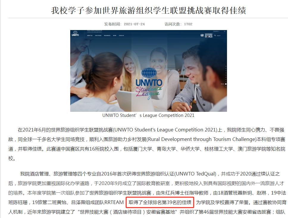 项目学生在世界旅游组织学生联盟挑战赛全球第39名