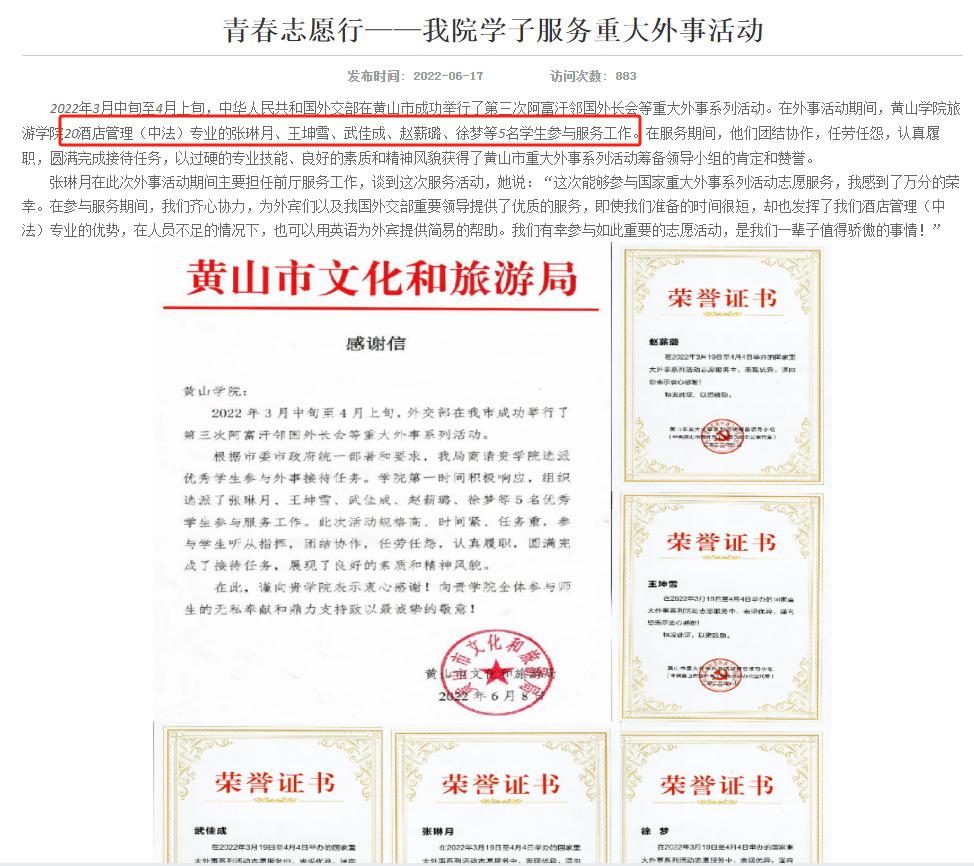 项目学生在国际舞台屡创佳绩。2021年世界旅游组织学生联盟挑战赛全球第39名,圆满完成世界名山学术研讨会、2022年北京冬奥会和冬残奥会、第三次阿富汗邻国外长会议等重大活动志愿服务,2023年斩获第十三届全国旅游院校服务技能大赛二等奖。