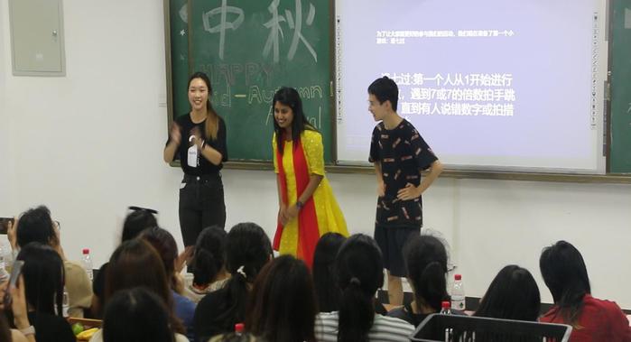 随后进行“逢七过”小游戏,并让现场留学生轮流上场介绍自己和自己家乡的重要节日及传统习俗。孟加拉留学生美慧给大家分享了自己国家的传统节日古尔邦节,那也是一个充满喜庆与团聚的节日,类似中国的中秋节。
