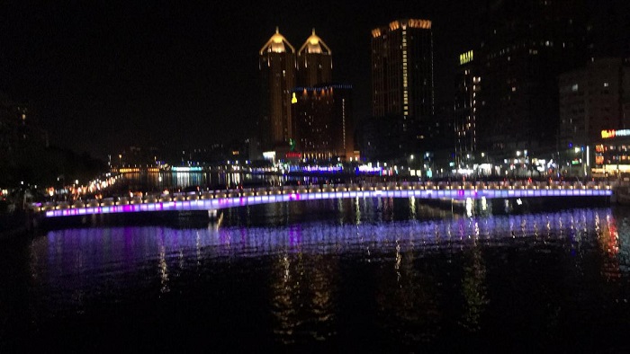 初到台湾,它给我的第一感觉就是小巧但又什么都不缺。台湾不像上海、也不像杭州。它没有内地城市那样的繁华和新兴。高雄,它给我的第一印象是旧但很有韵味。不能一下就感受到它独特的内涵与风貌,需要慢慢发掘才能体会到它的美。第一天晚上逛爱河灯会的时候,我能体验到属于台湾特有的喧闹,这喧闹并不是惹人厌烦的聒噪,恰恰相反,这一份特有的喧闹给高雄市增添了属于人的气息。在我看来这是属于他们的生活方式,喧闹的小街,拥挤的人群,炫目而又不刺眼的霓虹灯广告牌。