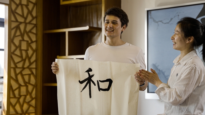 书法教学环节,汪亭云老师展示了毛笔字“和”字的书写技巧,留学生们体验了平衡和流畅的艺术之美。汪老师还指导留学生们进行现场实践书写,强调“毛笔书写要轻重交映,神形兼备,讲究和谐之美”。