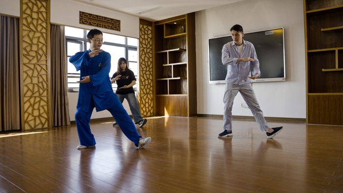 武术课程环节,王庆庆老师带领留学生们练习太极拳,并讲解太极拳理念。太极拳讲究人与自然融合,提倡肢体柔和缓慢,心静体松,既重外练又重内养,既练形体又调心理,生动体现了“天人合一”的和谐内涵。留学生们在老师的指导下,感受到刚柔并济的力量与和谐。