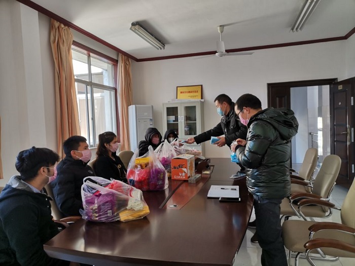 会后,留学生管理教师深入留学生宿舍慰问在校留学生,并了解宿舍卫生防疫及消防安全情况,向在校留学生送去日用主食、水果等春节慰问品,祝他们假期快乐,过一个健康平安的中国春节。
