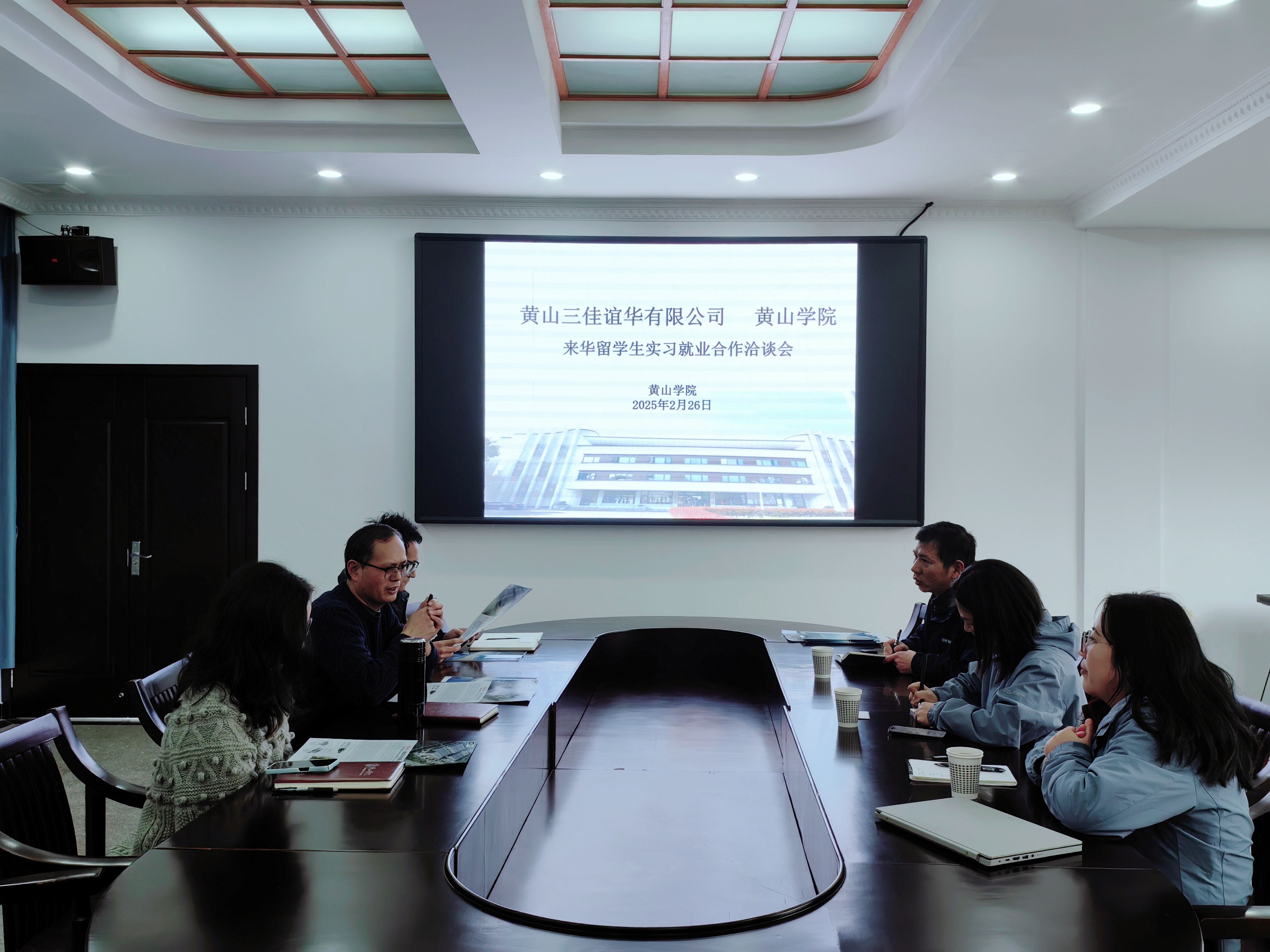 2月26日,黄山三佳谊华精密机械有限公司总务部部长方小慧、人事部部长胡新祥等一行3人,来校洽谈来华留学生实习就业、校企合作相关事宜。国际交流与合作处相关人员及留学生管理教师参加座谈交流。