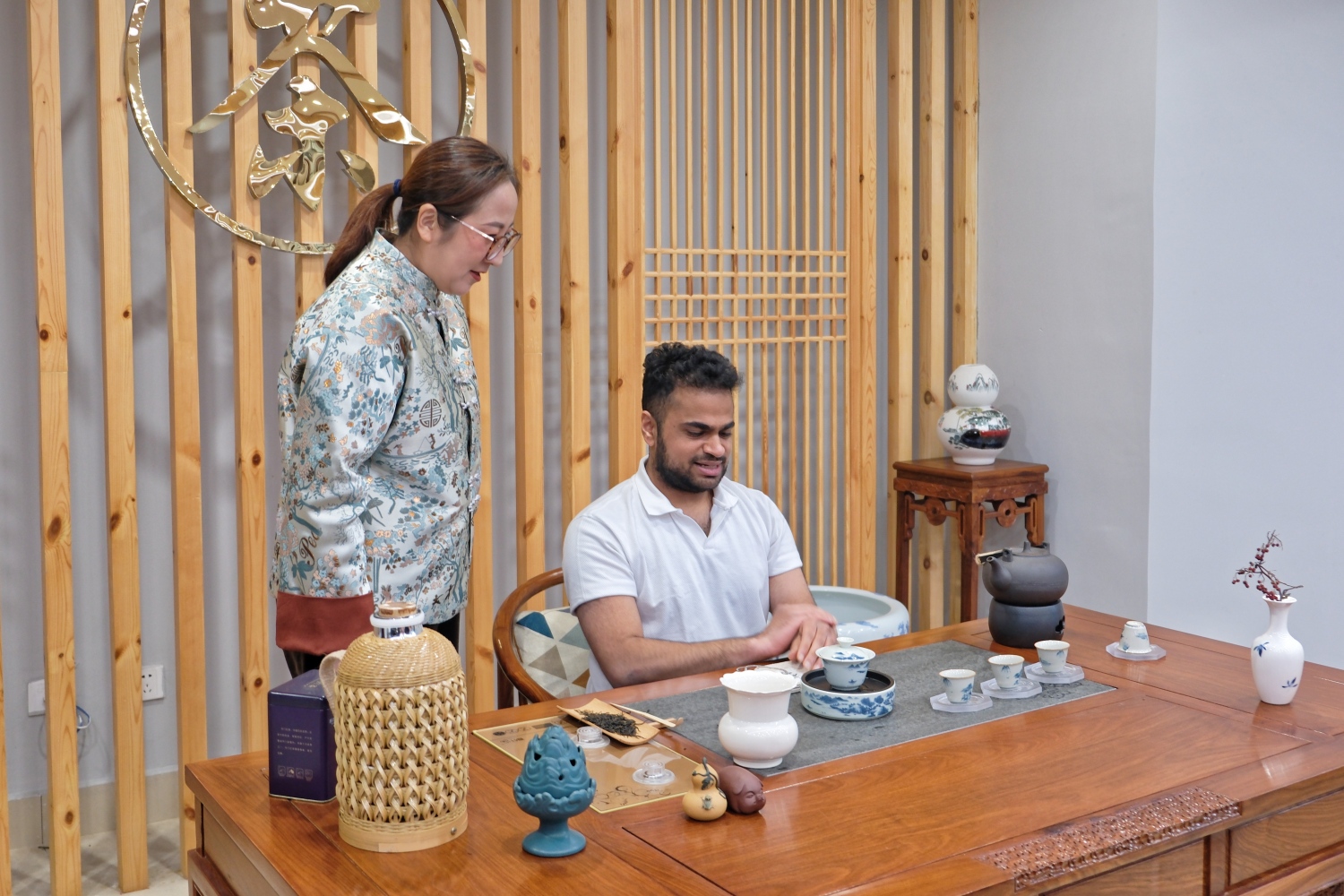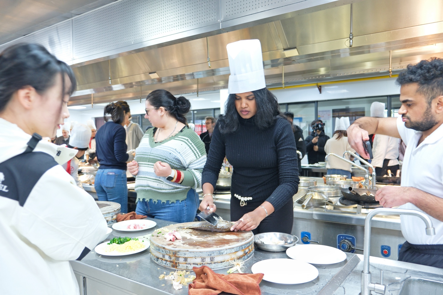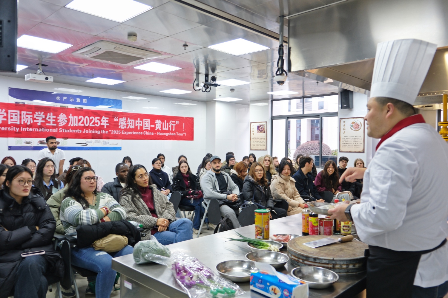 开班仪式结束,代表团开启徽州文化体验之旅。旅游学院代华博士以“徽州文化溯源”为主题,讲解了徽州文化的历史演进与核心内涵。在茶艺实训室,陈丽威老师通过茶艺演示,让留学生们体验徽茶文化的仪式美学。午间实践环节,烹饪实训室主任黄玉海指导留学生亲手制作徽菜经典“臭鳜鱼”。