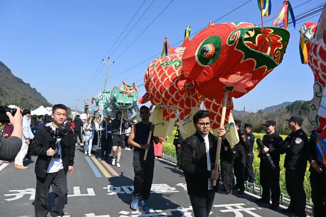 活动采用山水实景+文化展演的沉浸式体验模式。在齐云山泼墨山水般的背景里,我校留学生组成的国际鱼灯队穿梭于花径,与得胜鼓铿锵的节奏、状元郎互动的妙趣、货郎花车的市井风情交织成一幅流动的民俗画卷。