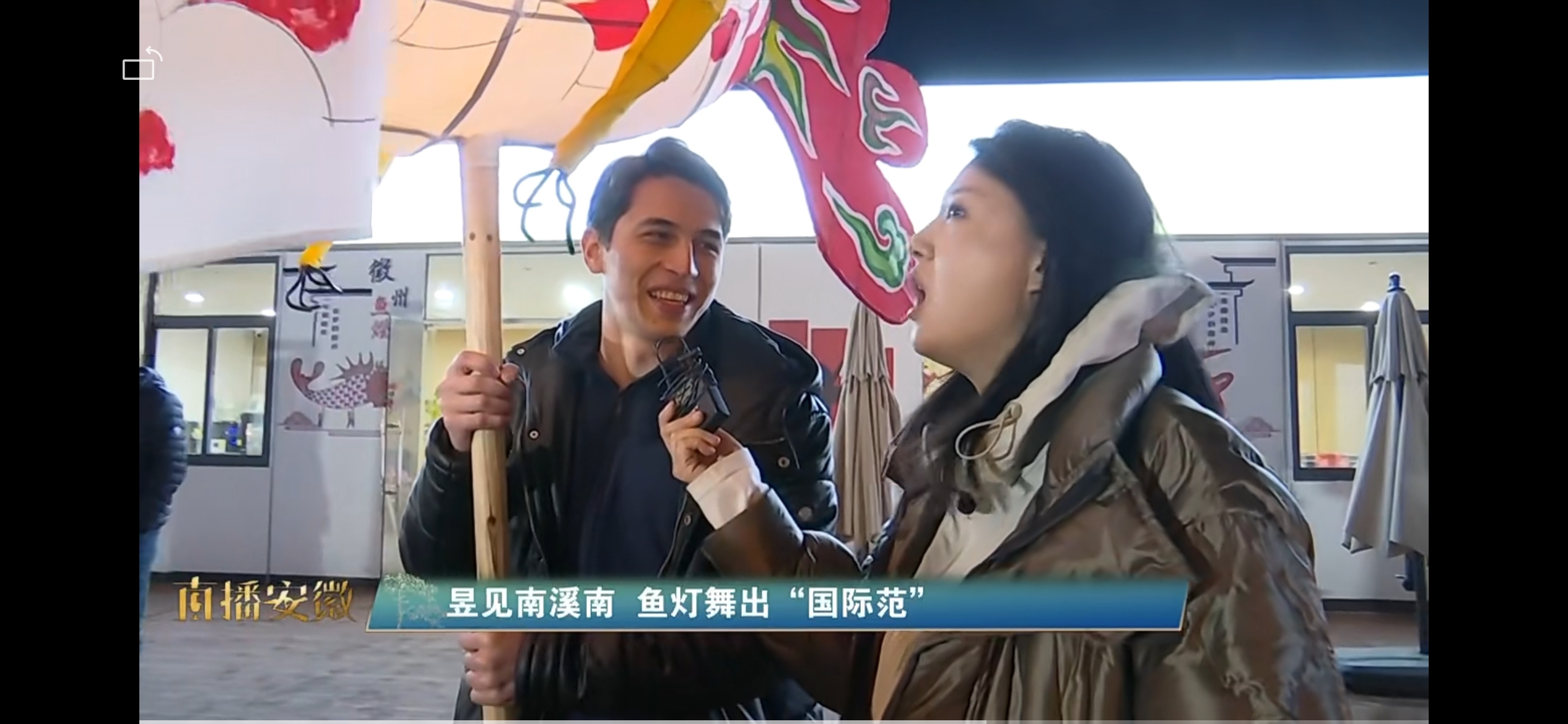 在国际鱼灯表演环节,我校留学生们手持精心制作的鱼灯,随着直播的镜头翻转、摆动,一条条鱼灯仿佛在夜色的海洋中畅游。安徽广播电视台的直播记者现场采访了来自乌兹别克斯坦的留学生马赫,他在采访中说:“我爱中国,我也爱中国的文化,所以我来到中国学习,我将来想留在中国发展。”其他留学生也纷纷表达了对中国传统文化的热爱。